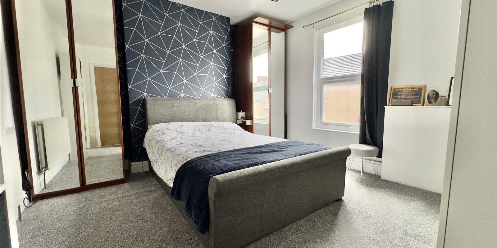To the front of the property, the welcoming reception room features a beautiful bay window fitted with bespoke upvc blinds, a feature fireplace with a modern electric fire, plush carpeting and rich teal walls complemented by tasteful wallpaper. This cosy yet stylish room provides the perfect setting for relaxing with family.