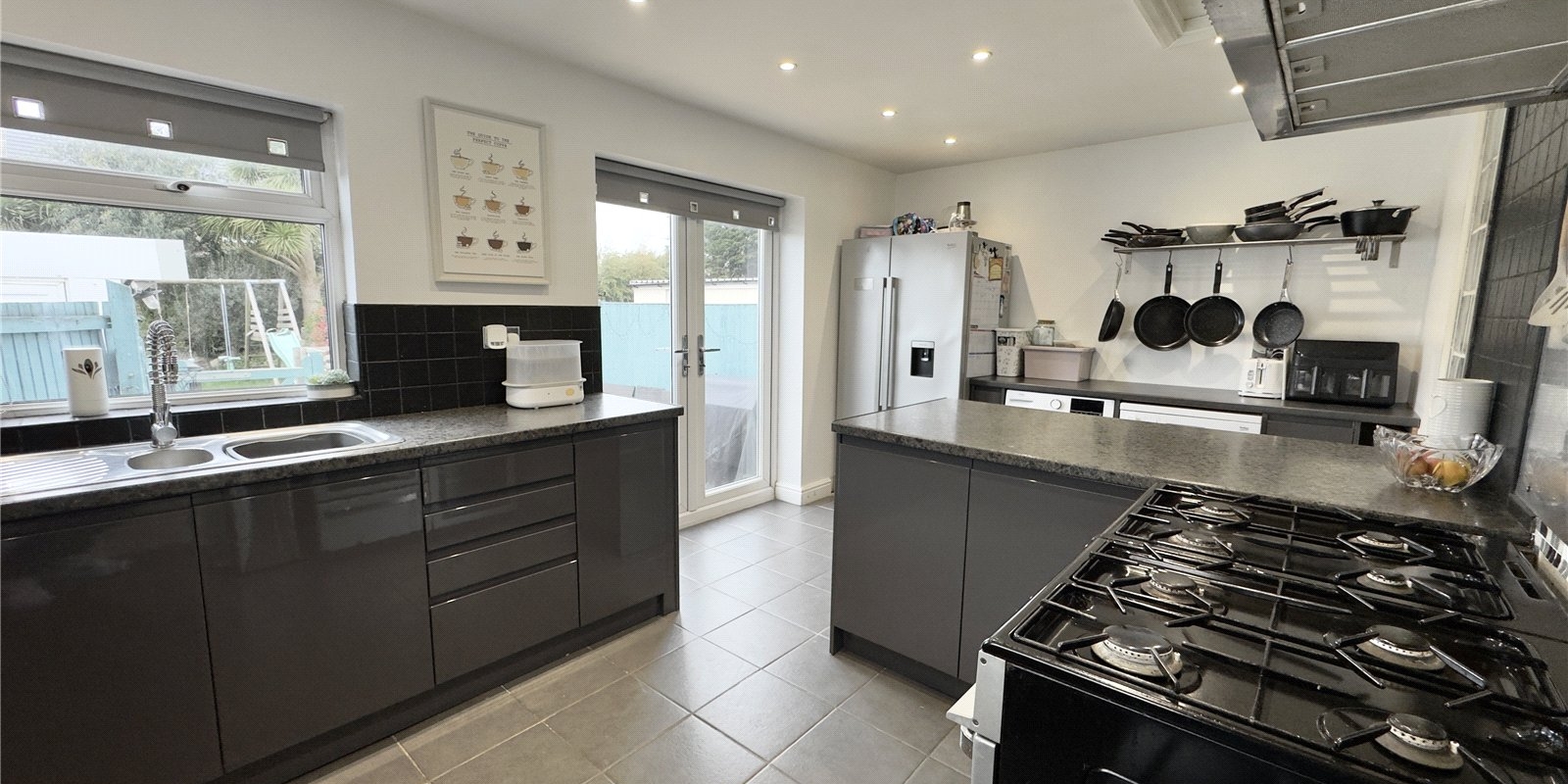 A breakfast bar provides a sociable spot for casual dining, while double doors open directly onto the rear garden, allowing for an abundance of natural light and easy indoor-outdoor living.