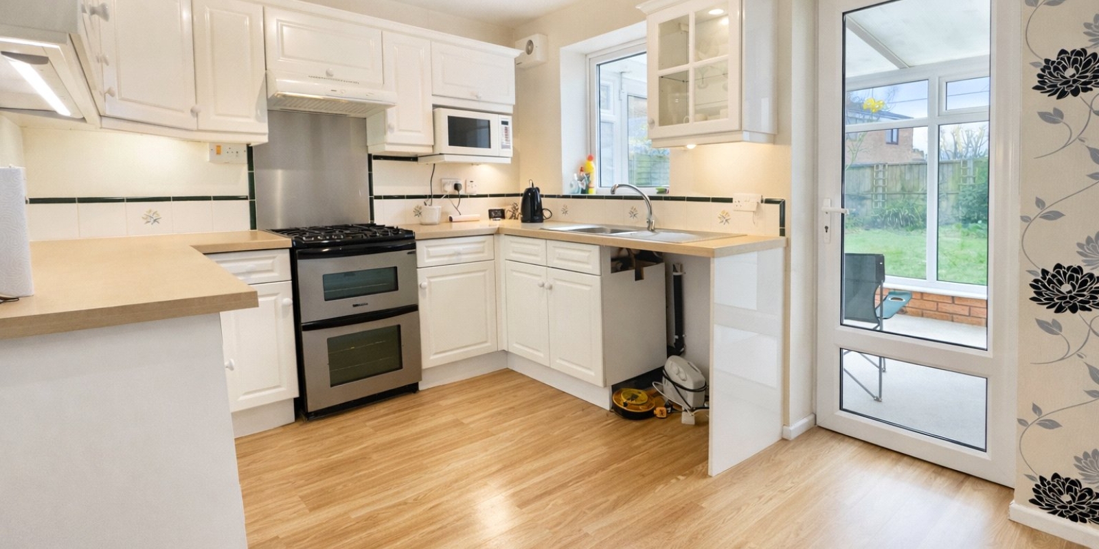 To the first floor, there are two well-proportioned bedrooms, both with storage, along with a landing cupboard housing the boiler and a modern white bathroom suite with a shower over the bath. The property enjoys an abundance of natural light throughout, further enhancing its warm and inviting feel.