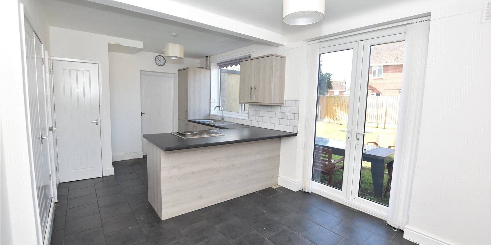 Patio doors from the kitchen open directly onto the rear garden, creating a seamless flow between indoor and outdoor spaces, ideal for summer entertaining or enjoying a morning coffee in the fresh air.
