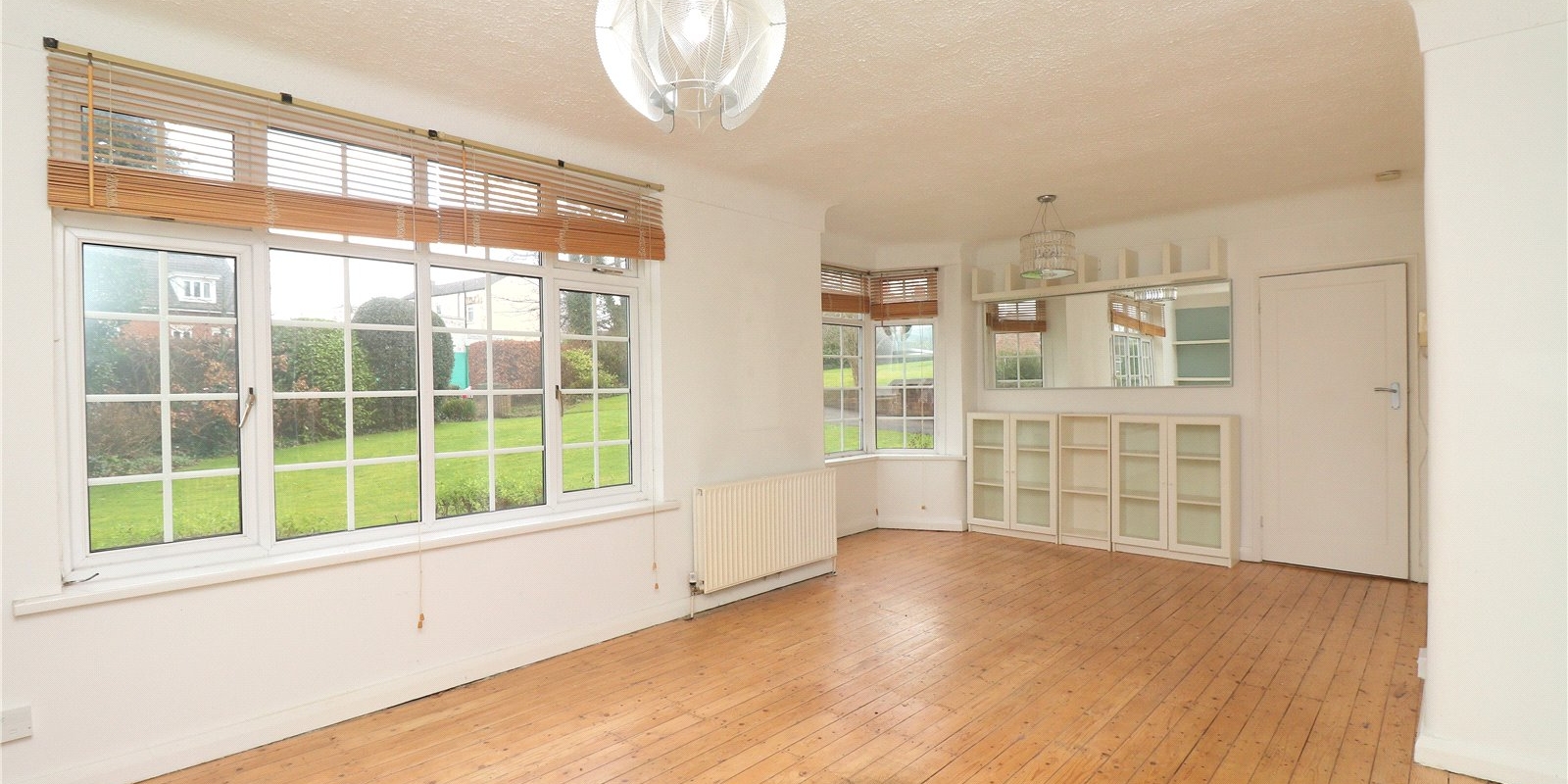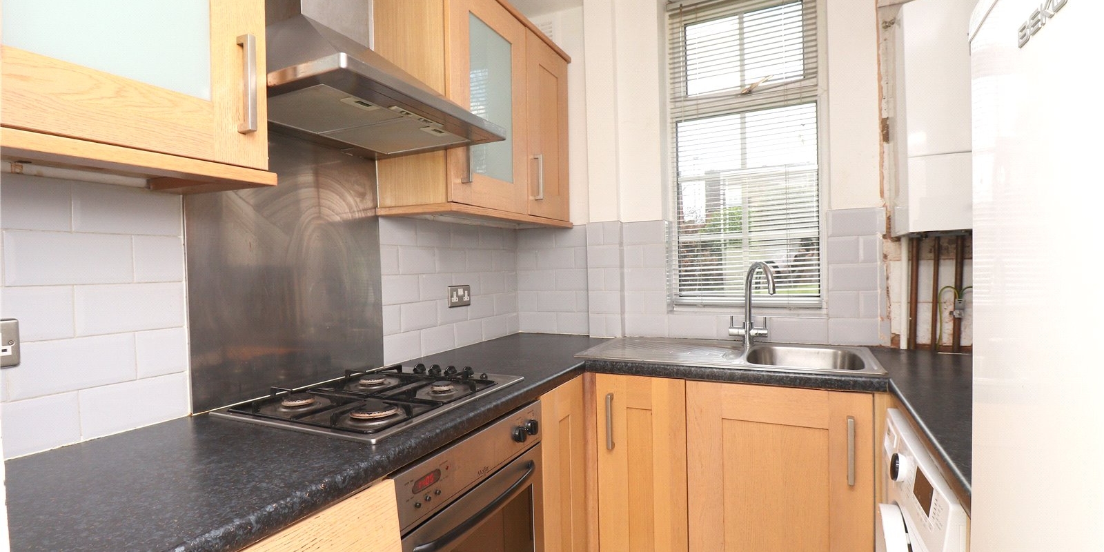 Upon entering the property you're greeted by a hallway with storage space to the right and the kitchen in front. The kitchen has ample counter and cupboard space for all your culinary needs and is also home to the boiler, as this flat is equipped with a central heating system. The lounge/diner is an open plan space with hardwood flooring and bay windows, flooding the room with natural light. Off the living room to the rear, is another hallway connecting the two bedrooms and the family bathroom that services the flat.
