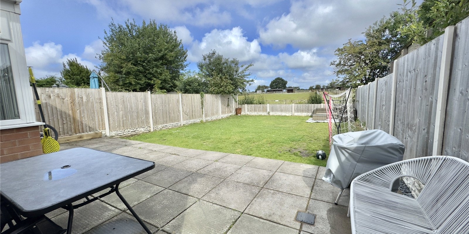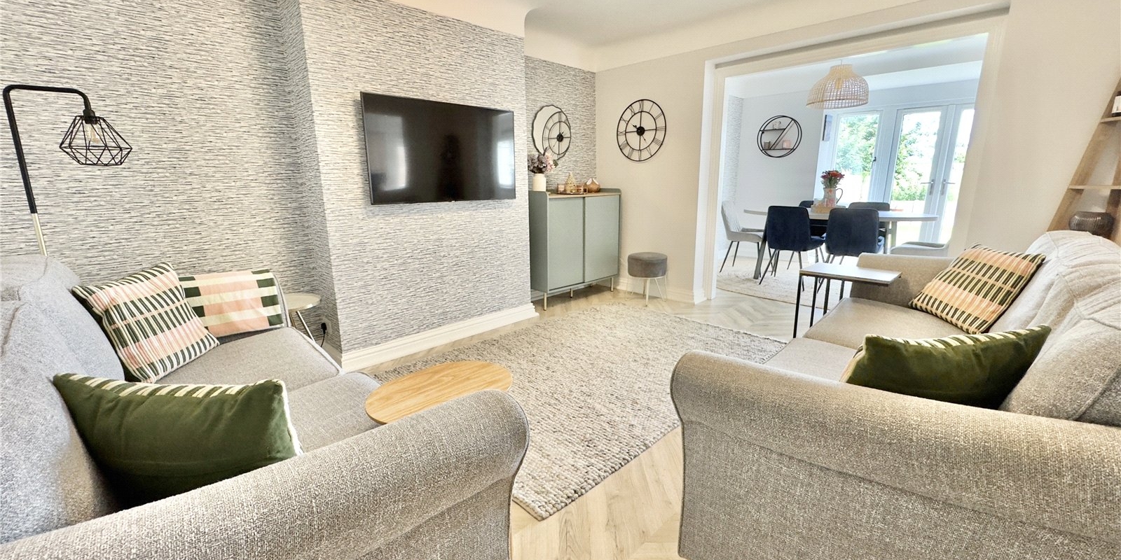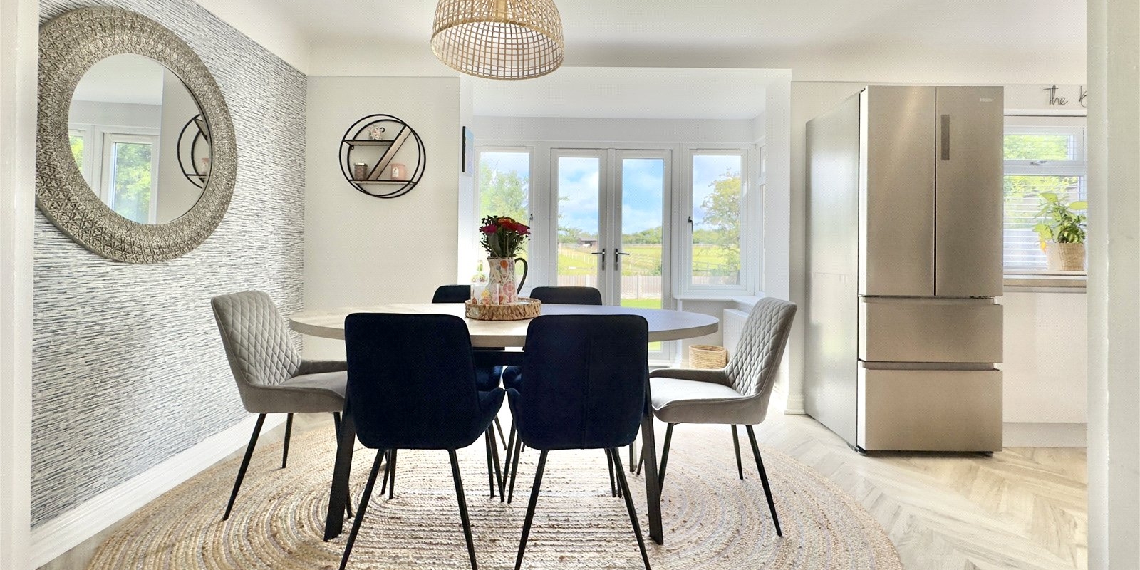 The home welcomes you with a bright and spacious entrance hallway, leading to a cosy front lounge ideal for relaxing. The standout feature of the property is the stunning open-plan kitchen, living, and dining area — a truly modern space that blends practicality with comfort. The sleek, contemporary kitchen flows seamlessly into a dining area and then into a comfortable sitting/snug area, with French doors that open out to the rear garden. The garden itself offers both a patio and a lawned section, perfect for entertaining or enjoying the outdoors, and benefits from beautiful open views across fields to the rear.