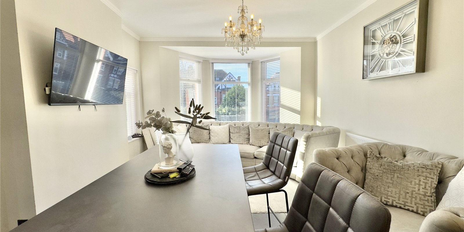 Upstairs, the property opens out into an impressive open-plan kitchen, dining and living area. Bathed in natural light from a striking bay window, this versatile space combines modern design with a sense of calm and openness. The newly installed kitchen features sleek grey cabinetry and a sizeable central island, perfect for relaxed meals or entertaining friends.