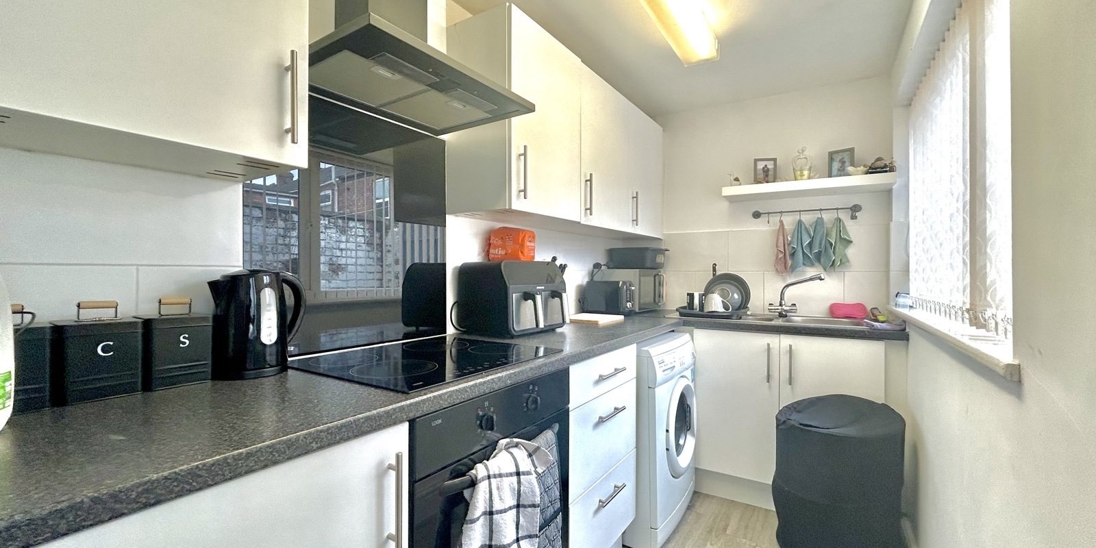 The ground floor features a generous open-plan lounge and dining room, offering a bright and sociable space with great flow. To the rear sits a modern fitted kitchen, thoughtfully extended into the yard space to create additional worktop and storage capacity.