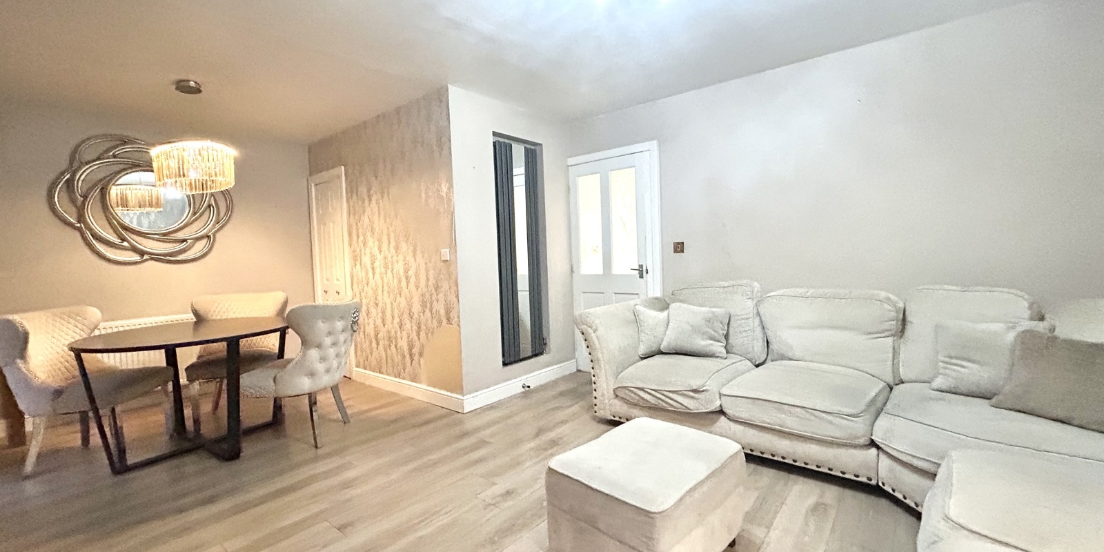To the rear, the spacious lounge/dining area is both stylish and practical, featuring a built-in media wall and UPVC patio doors opening directly onto the rear garden. A convenient ground floor WC completes the ground level.