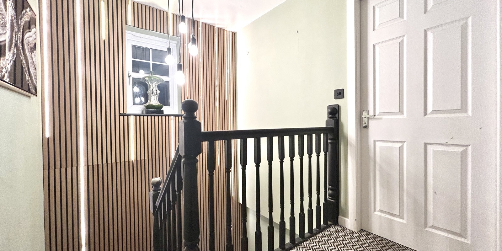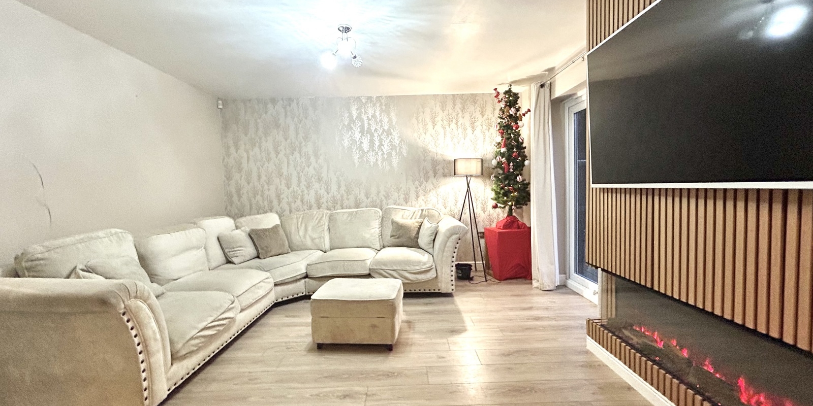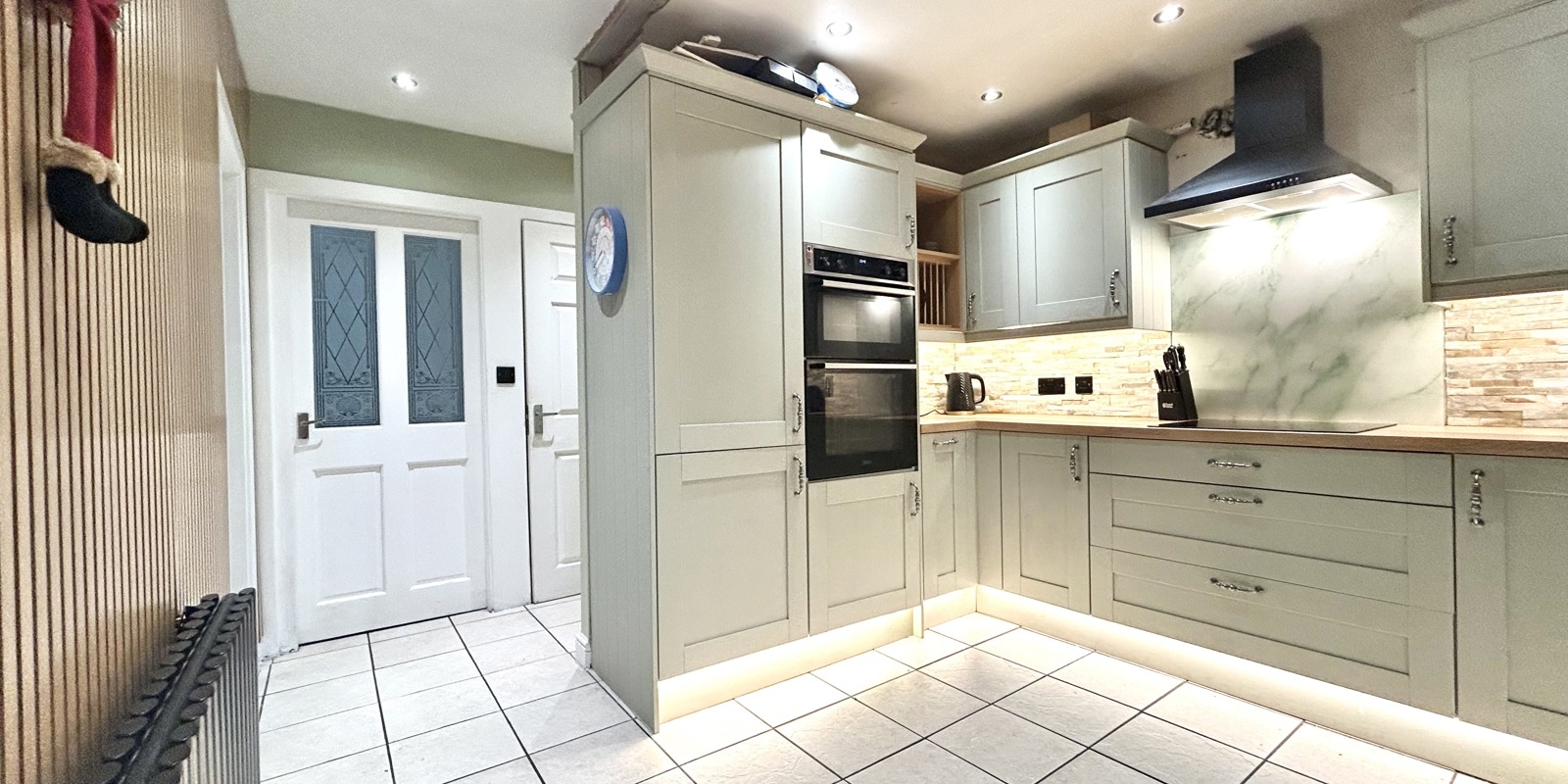 The staircase to the first floor is enhanced with feature acoustic wood panelling and integrated lighting, adding a contemporary design touch. The master bedroom benefits from an en-suite shower room, while bedrooms two and three are both well-proportioned doubles. The accommodation is completed by a modern three-piece family bathroom.