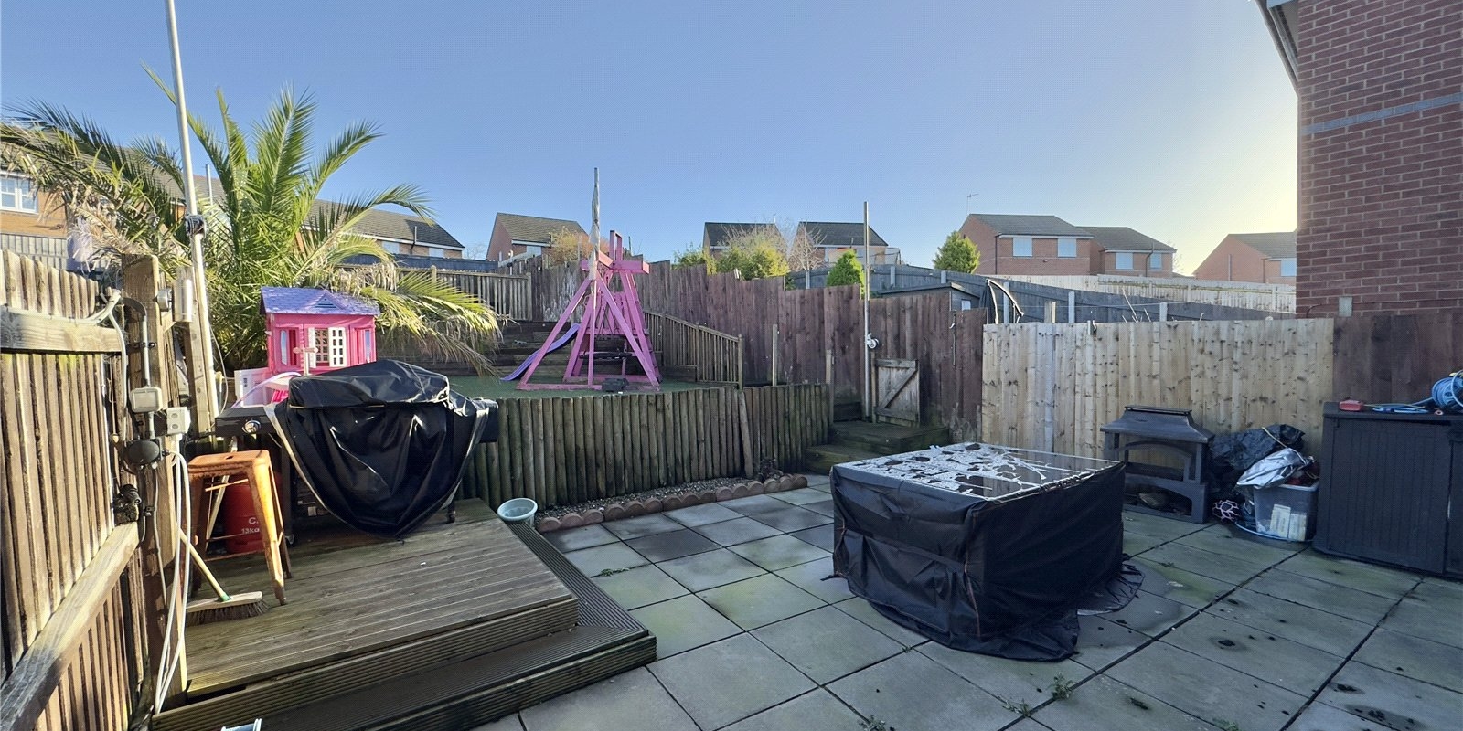 Externally, the property offers a driveway to the front, while the impressive rear garden is arranged over three tiers, including a patio seating area, an astro-turfed level ideal for children, and an upper decked area complete with electricity and Wi-Fi connections—perfect for entertaining or home working outdoors.