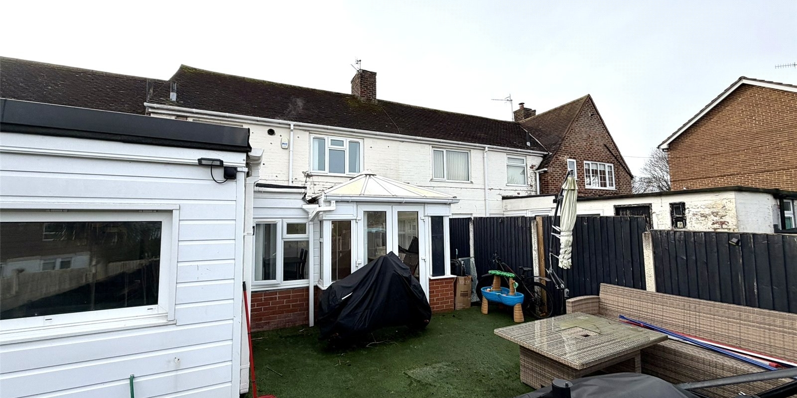 Upstairs, there are two well-proportioned double bedrooms and a good-sized single, all served by a contemporary three-piece family bathroom suite. Externally, the rear garden features a raised decked seating area leading down to a lawned garden, ideal for families and summer gatherings.