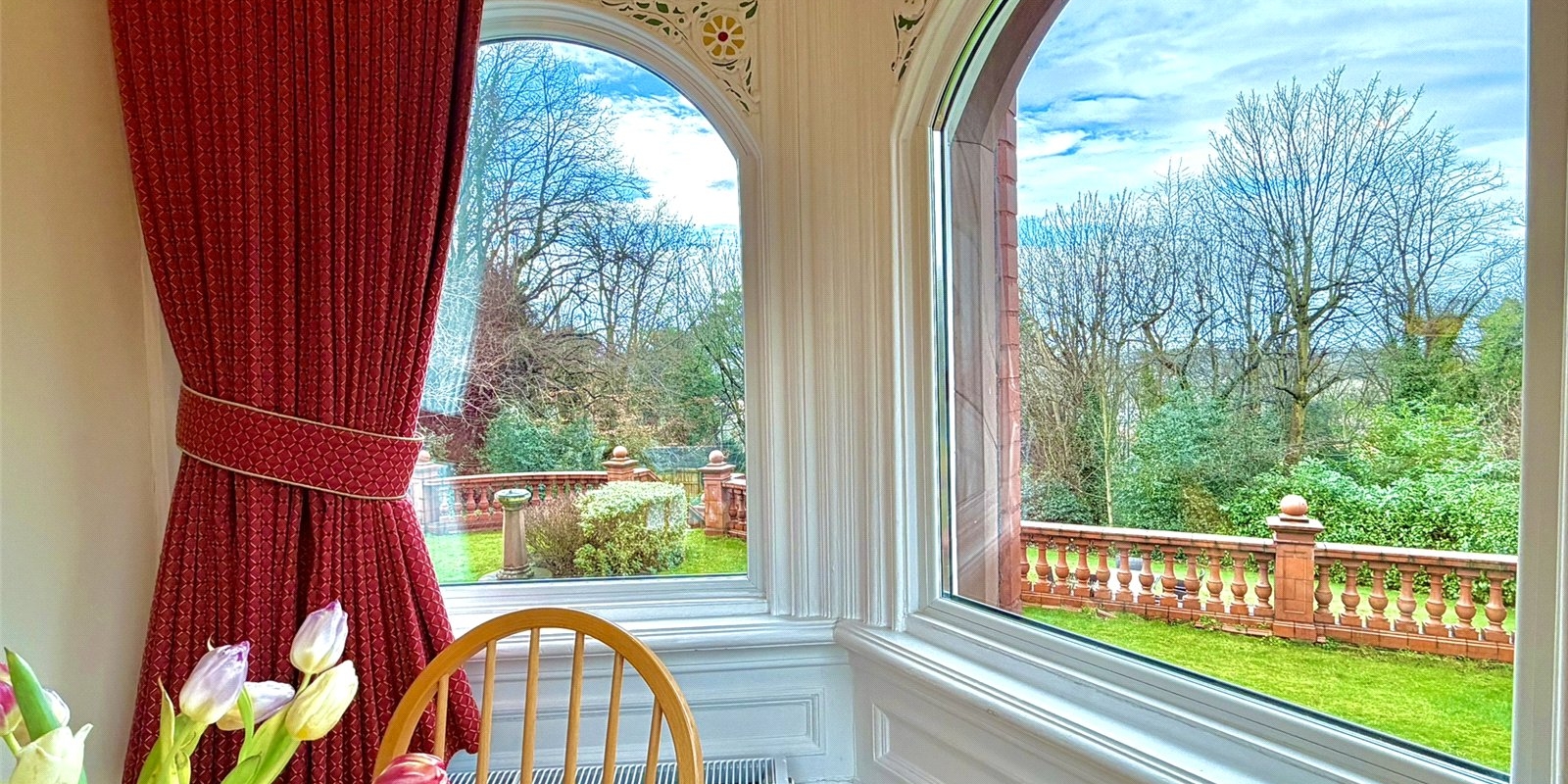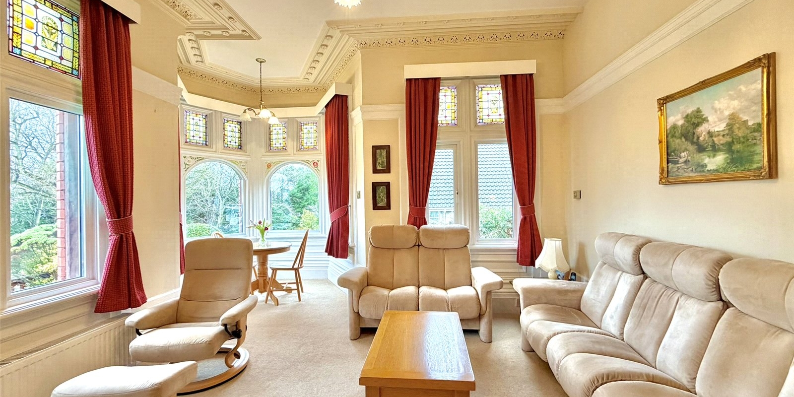 Arranged over two generous levels, the property showcases three grand reception rooms, each with its own distinct atmosphere. The principal lounge is a striking focal point, featuring a beautiful turret bay that provides the perfect setting for a dining table and entertaining guests.