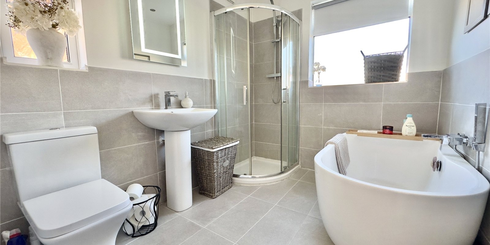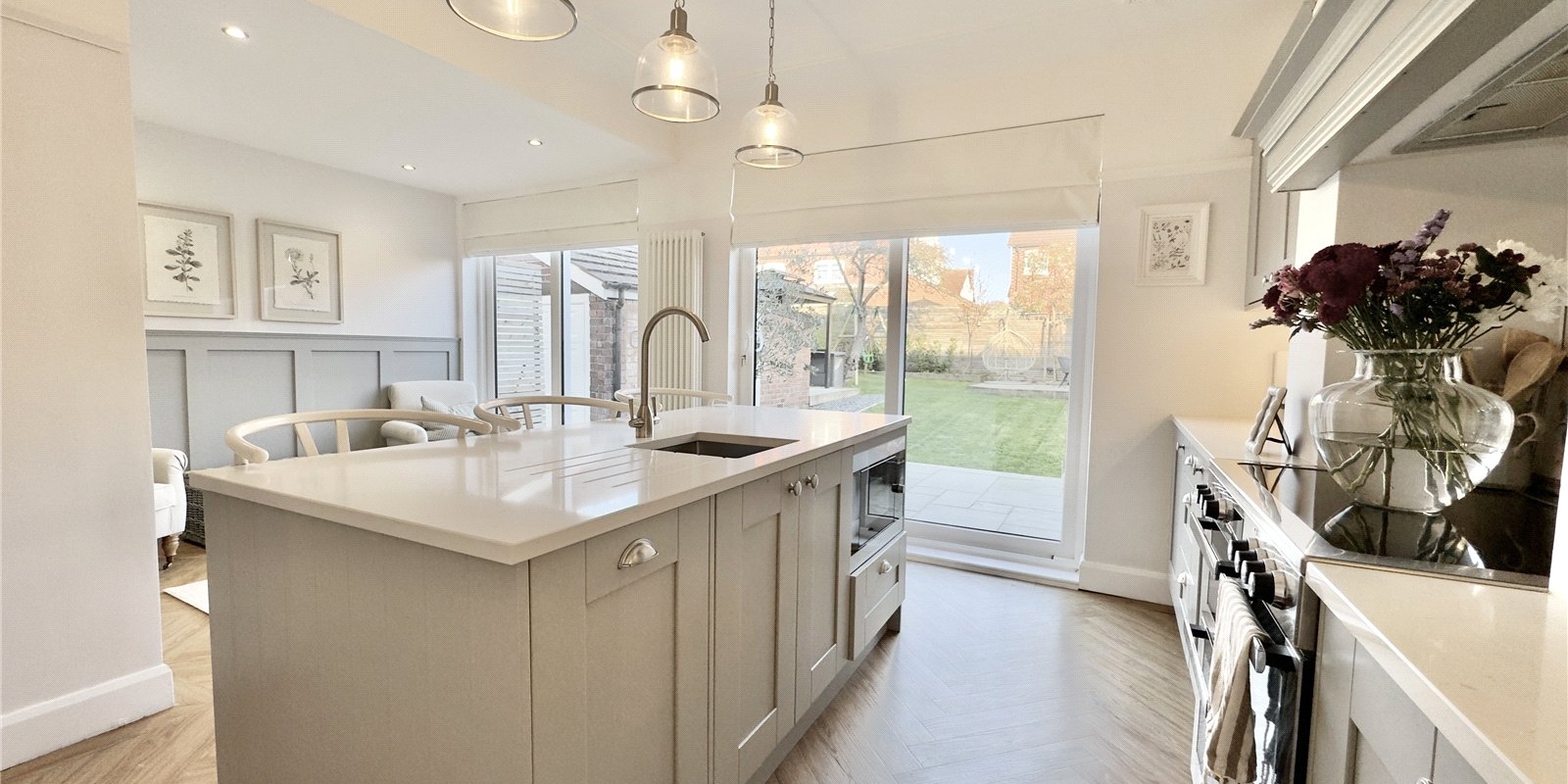 From the moment you step through the front door, the striking herringbone flooring sets the tone for the quality and attention to detail found throughout. The ground floor offers a welcoming front lounge alongside an impressive open-plan kitchen and dining space to the rear, complete with a bespoke fitted kitchen, centre island and sliding doors opening onto the garden—creating the perfect environment for both everyday living and entertaining. A convenient downstairs WC completes the ground floor accommodation.