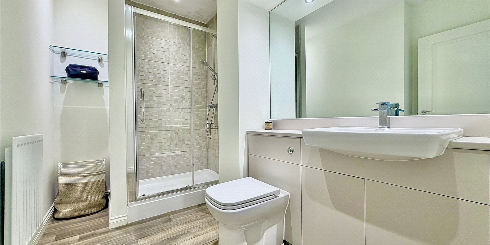 The modern fitted kitchen comes complete with a range of integrated appliances, while the master bedroom benefits from an en-suite shower room. A well-proportioned second double bedroom with fitted wardrobes and a stylish family bathroom complete the internal accommodation.