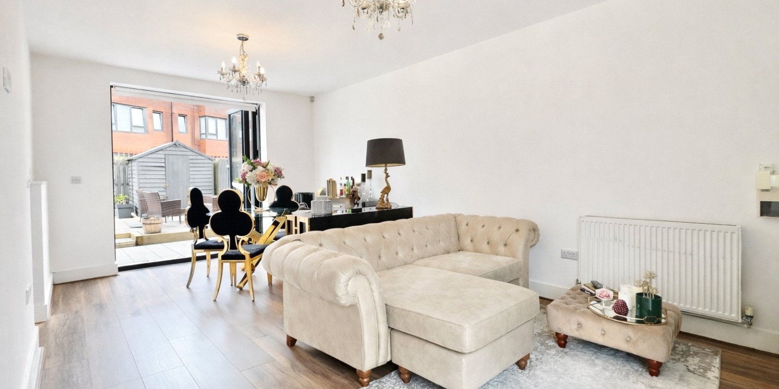 Upon entering, you are welcomed by an inviting entrance hallway with staircase rising to the first floor, a useful downstairs cloakroom and access through to the impressive open-plan living space. The bright and spacious living room features a striking floor-to-ceiling window to the front, flooding the room with natural light and creating a modern, airy feel. This flows seamlessly into the dining area and contemporary fitted kitchen, forming the true heart of the home. From here, stylish bi-folding doors open out onto the enclosed rear garden, providing the perfect setting for entertaining or relaxing during warmer months.