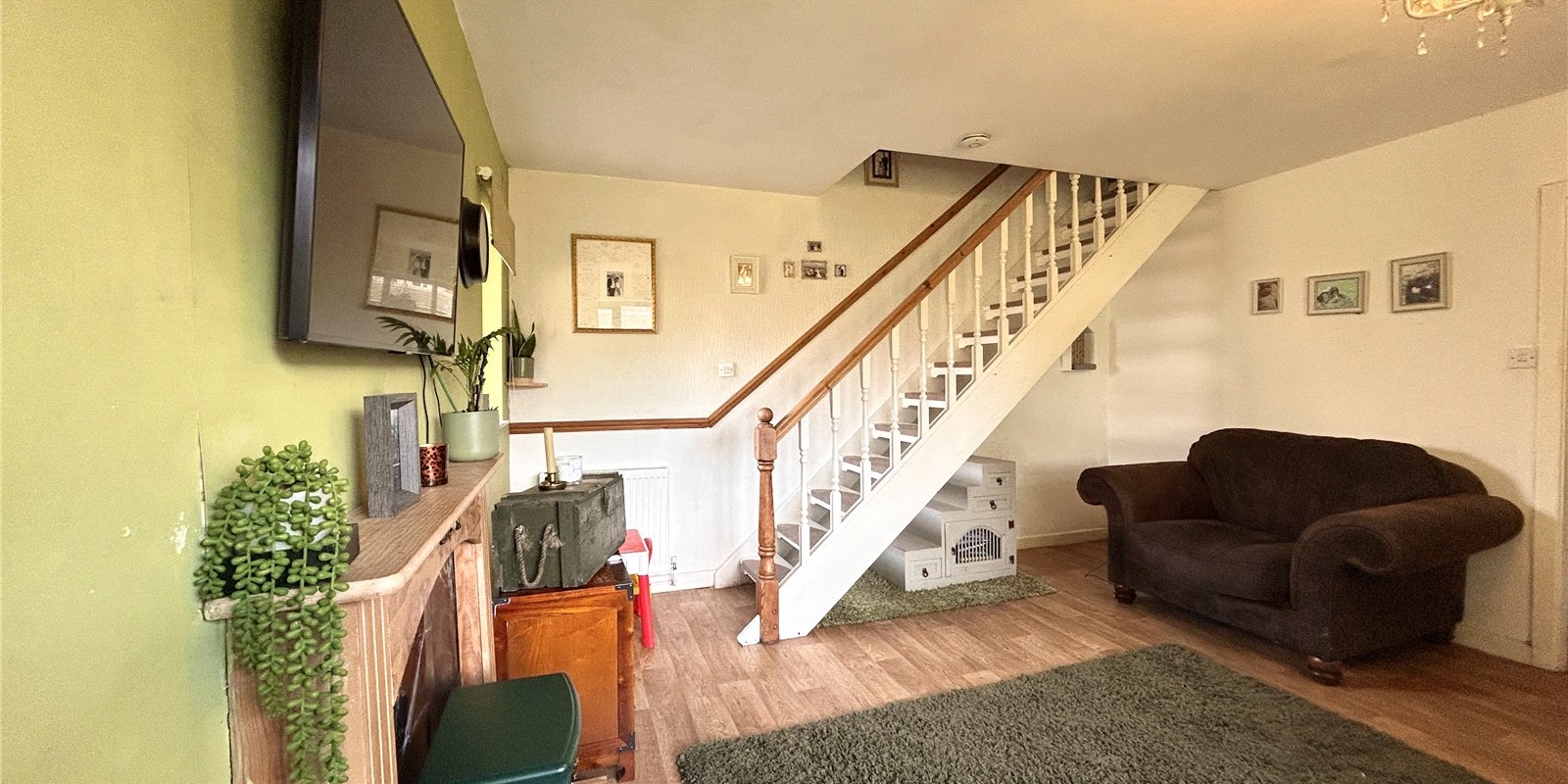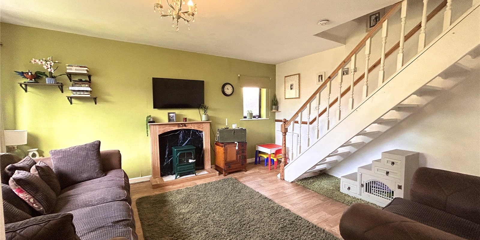 The accommodation briefly comprises: entrance porch, a generous lounge with feature open staircase, and a separate kitchen/diner — perfect for modern living and entertaining.