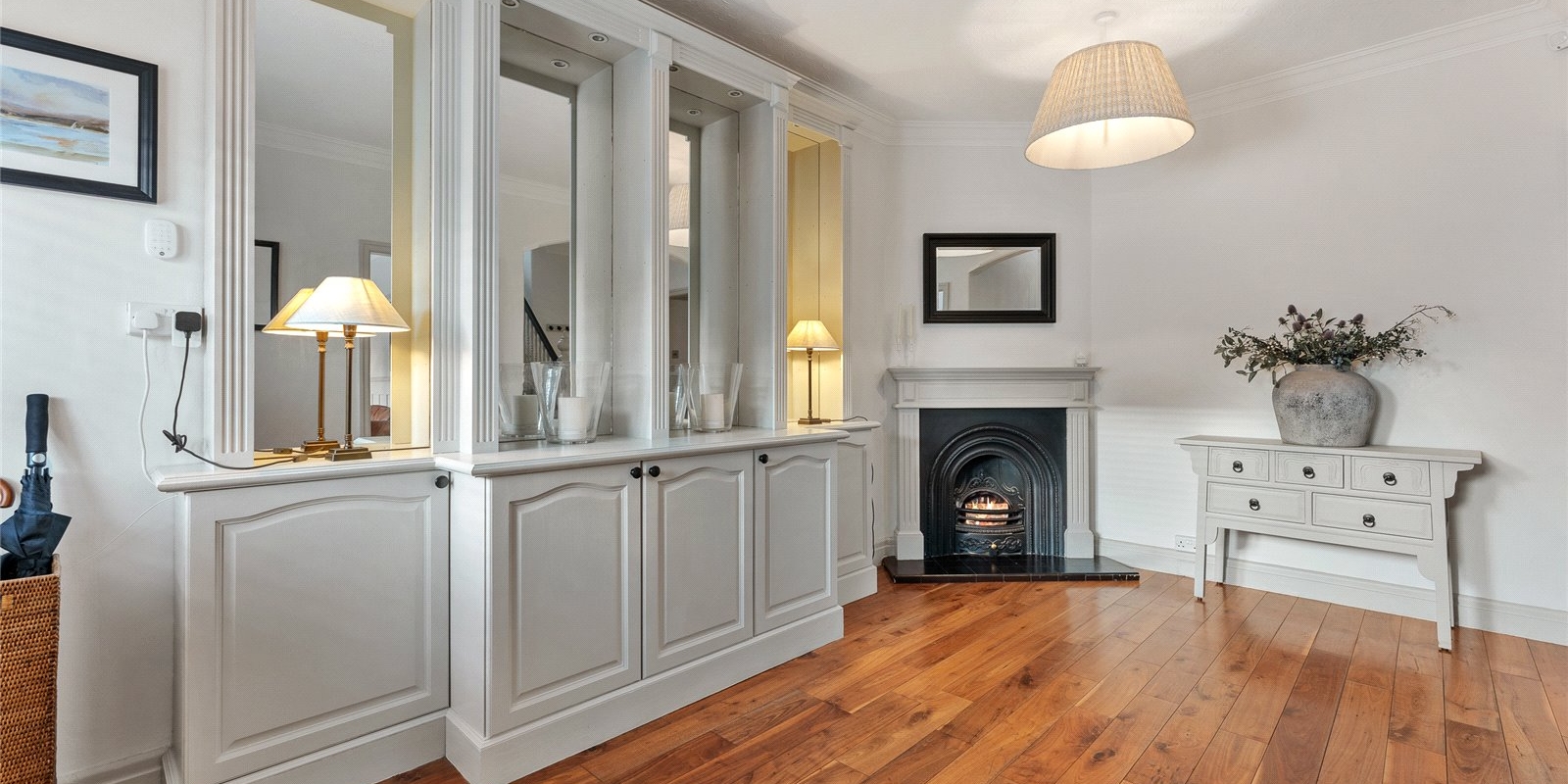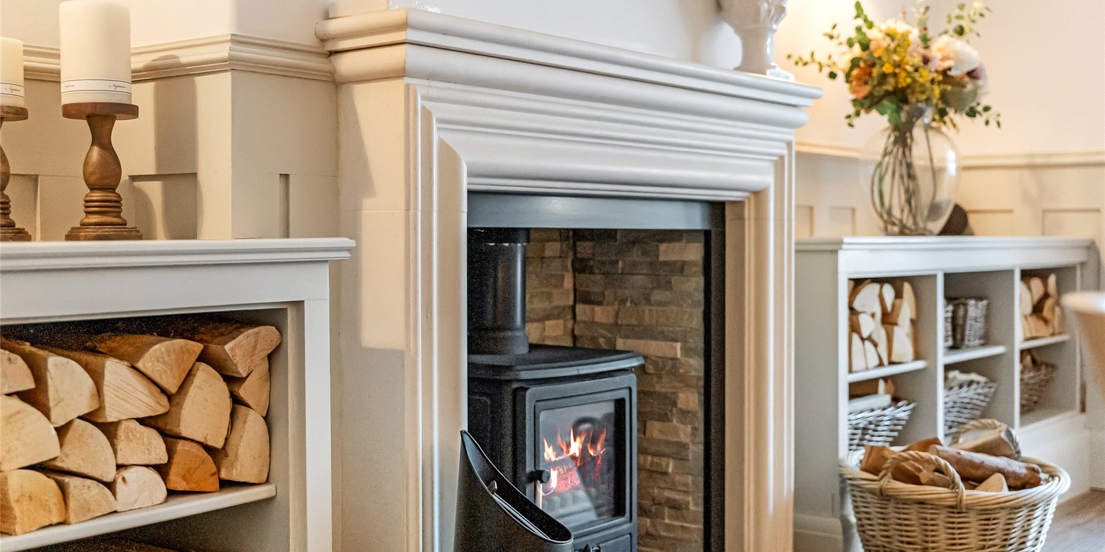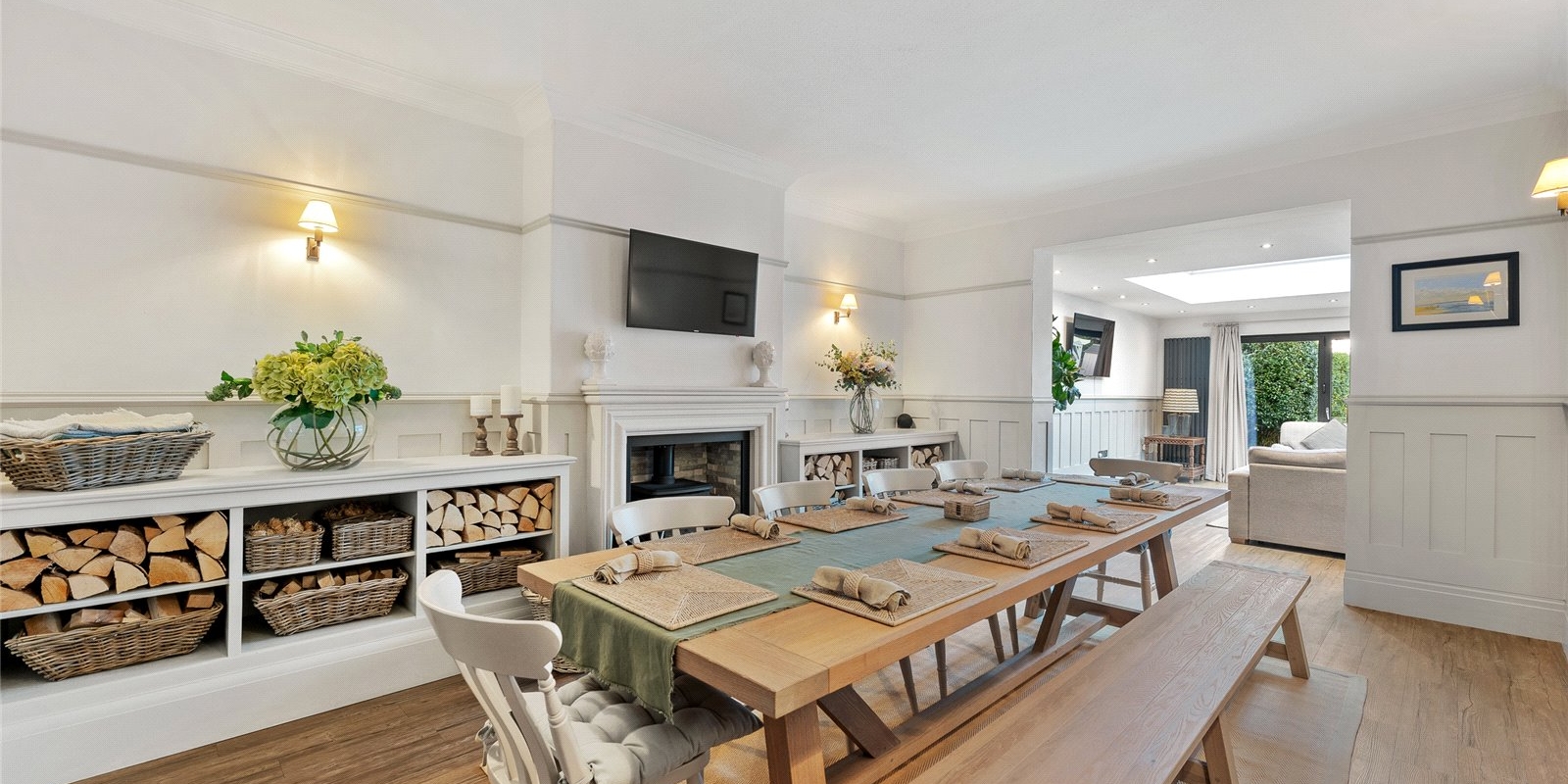From the moment you step inside, the attention to detail is immediately evident. The front lounge provides a warm and welcoming sanctuary, enhanced by the comfort of a log burner, while elegant finishes, a calm neutral palette, and quality materials flow throughout. Across the welcoming hallway, the dining room is equally impressive, featuring bespoke fitted cabinetry and a second log burner, creating a stylish setting for atmospheric dinner parties and family gatherings alike.