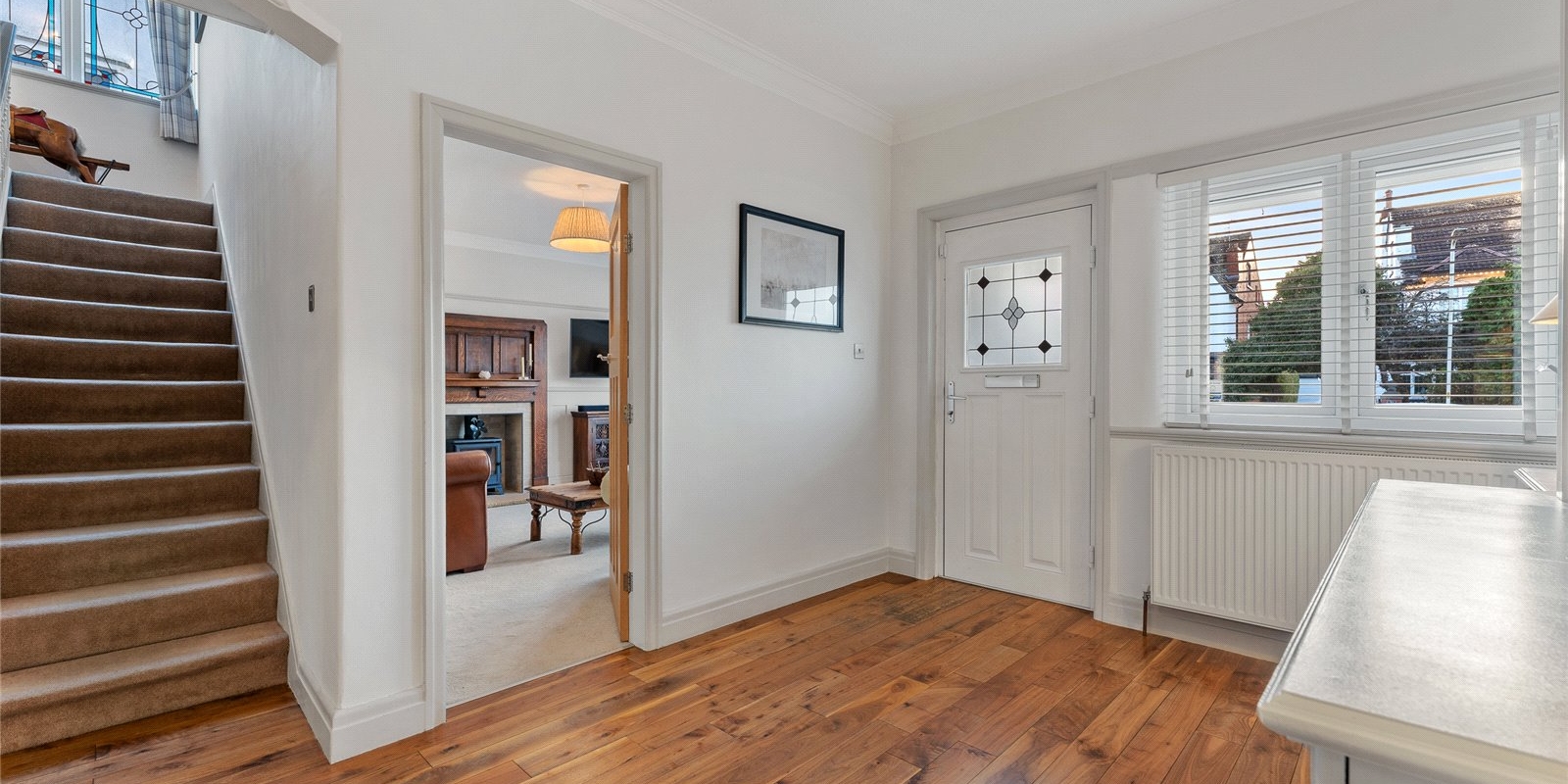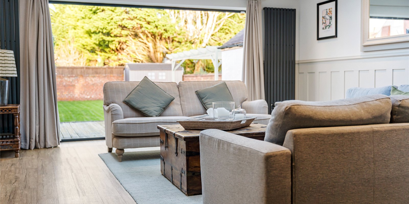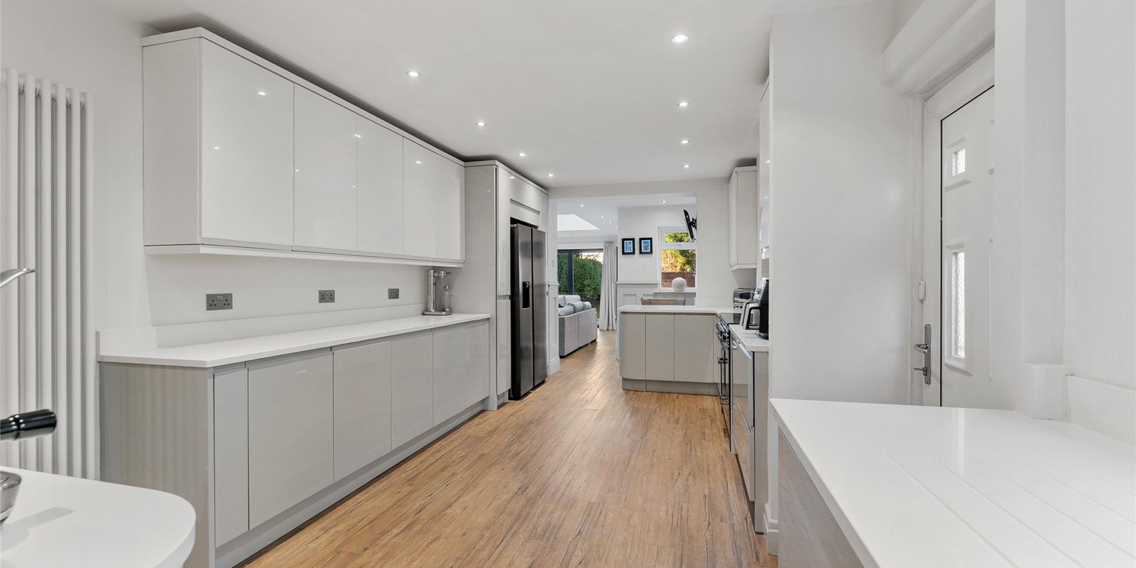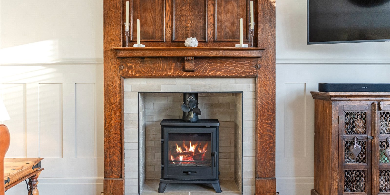 From the moment you step inside, the attention to detail is immediately evident. The front lounge provides a warm and welcoming sanctuary, enhanced by the comfort of a log burner, while elegant finishes, a calm neutral palette, and quality materials flow throughout. Across the welcoming hallway, the dining room is equally impressive, featuring bespoke fitted cabinetry and a second log burner, creating a stylish setting for atmospheric dinner parties and family gatherings alike.