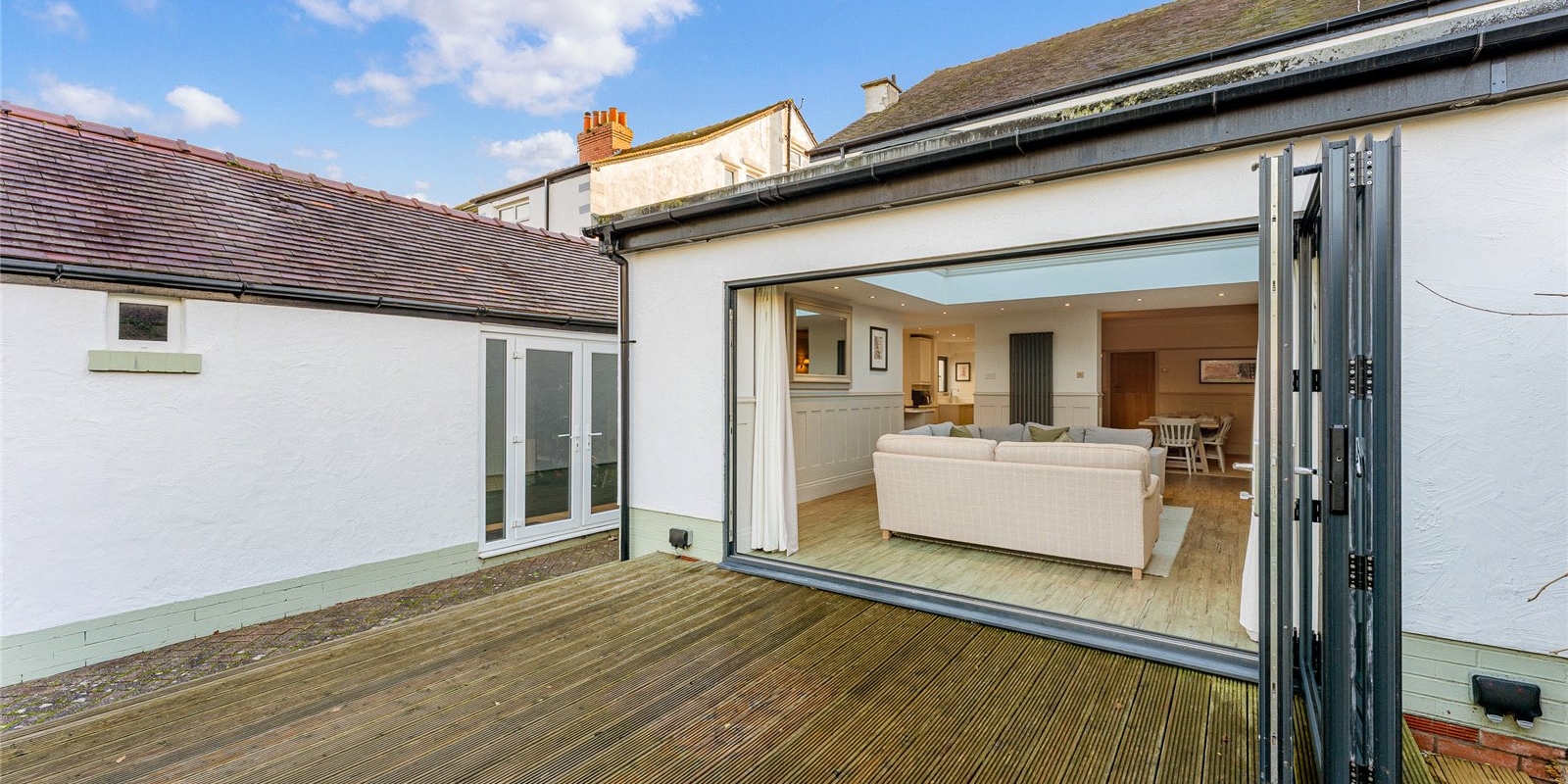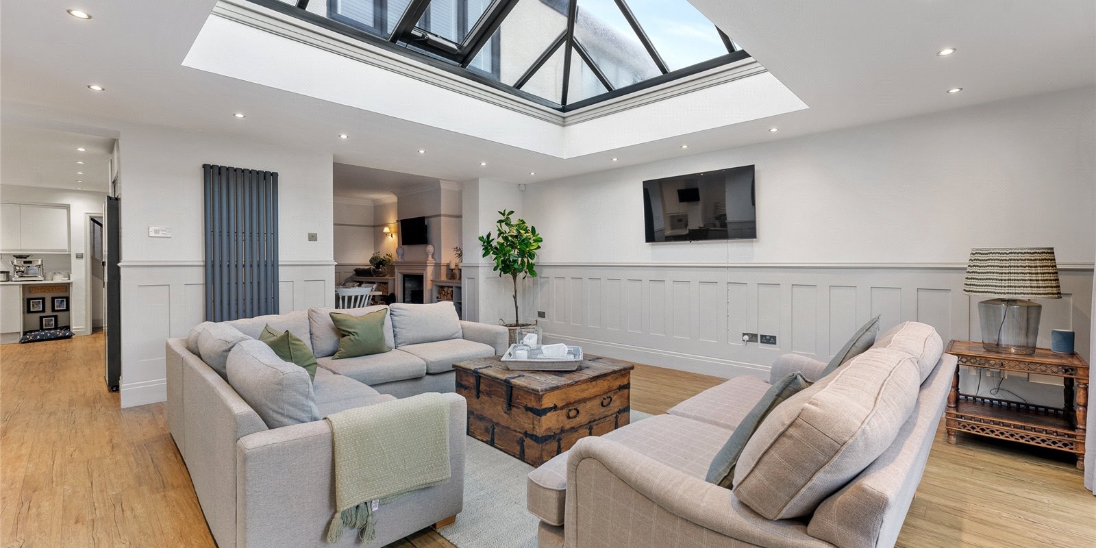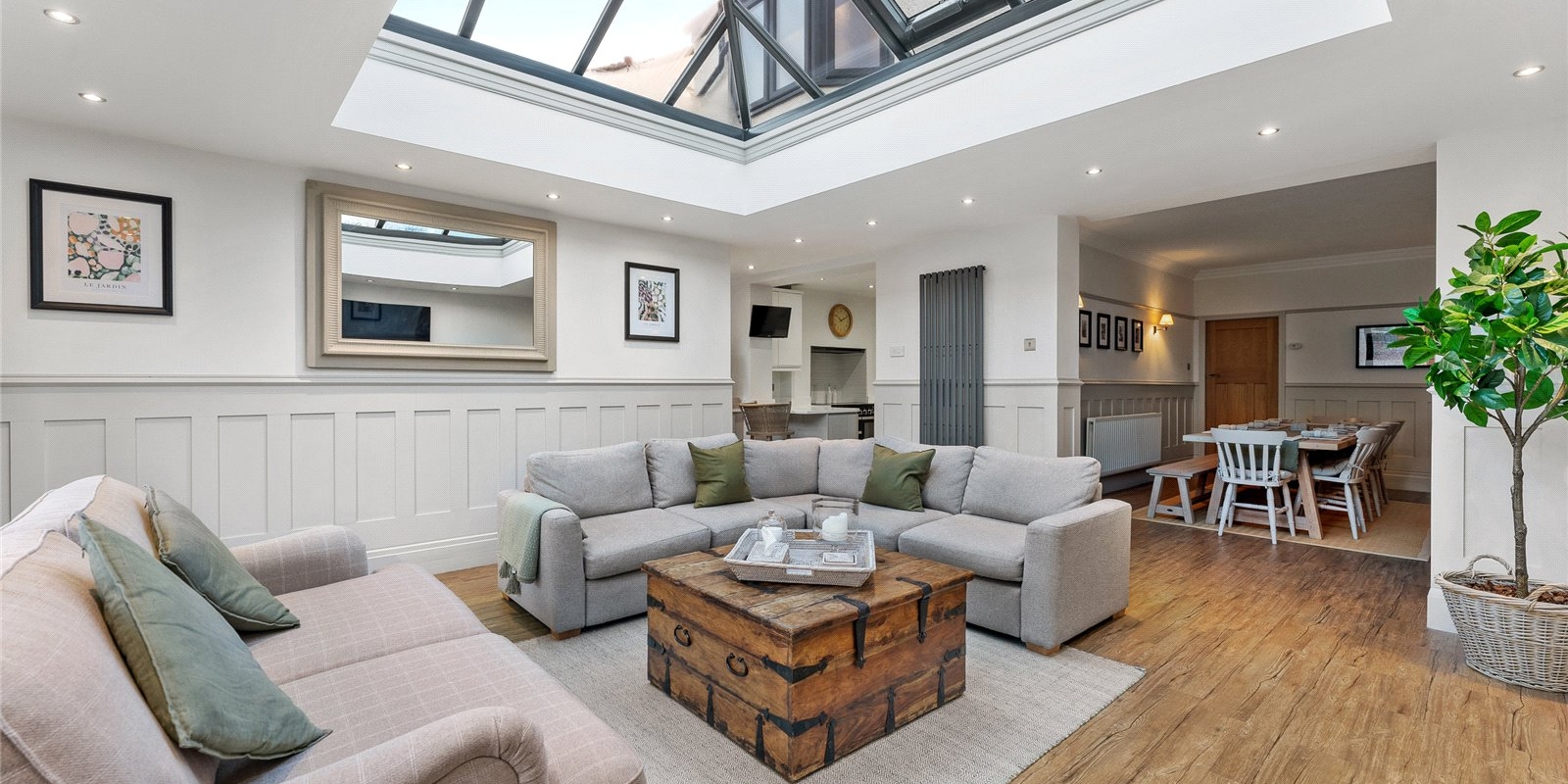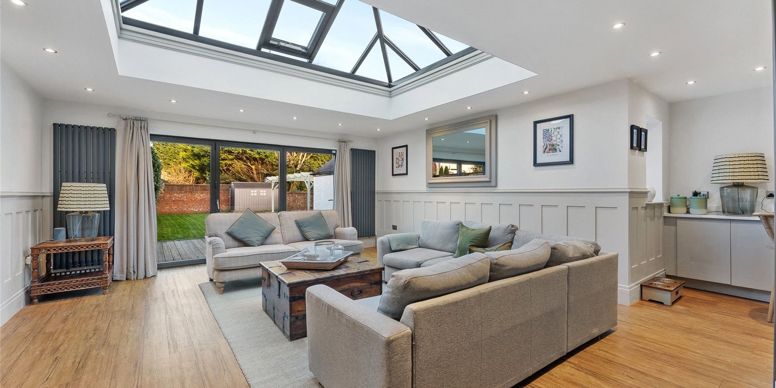 A striking lantern extension floods the heart of the home with natural light, forming a stunning open-plan living and dining space that connects effortlessly to the kitchen. Expansive bi-fold doors open directly onto the garden, establishing a seamless indoor-outdoor flow perfect for summer entertaining. The kitchen itself is a chef’s delight, centred around a statement Range cooker and designed to balance aesthetic appeal with family practicality. A separate utility room and a conveniently positioned guest WC ensure everyday essentials are neatly tucked away.