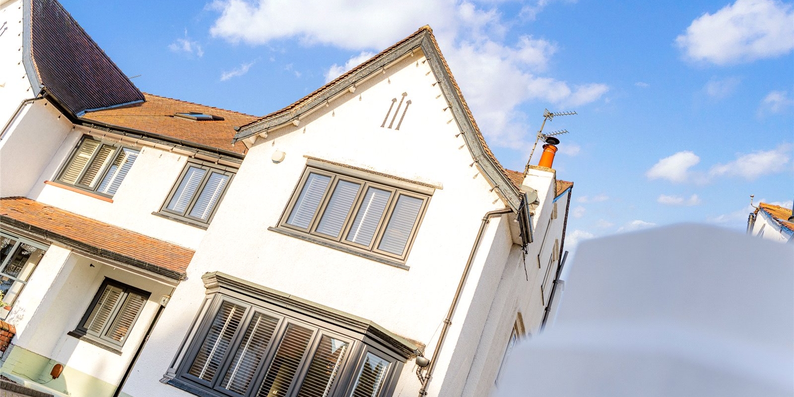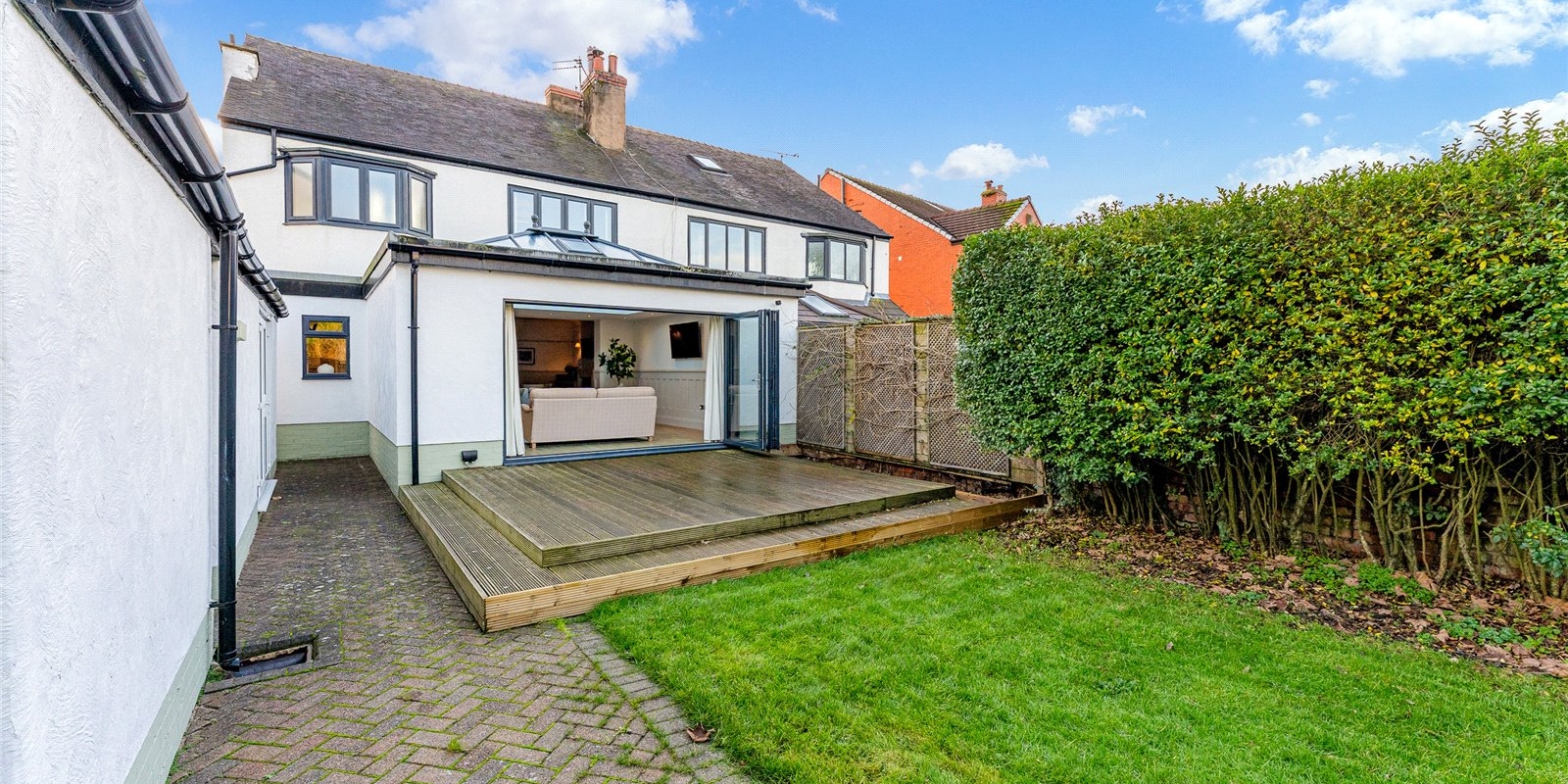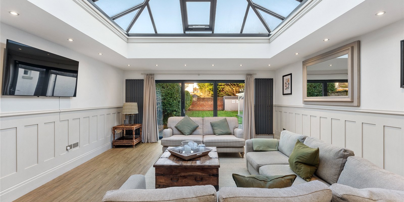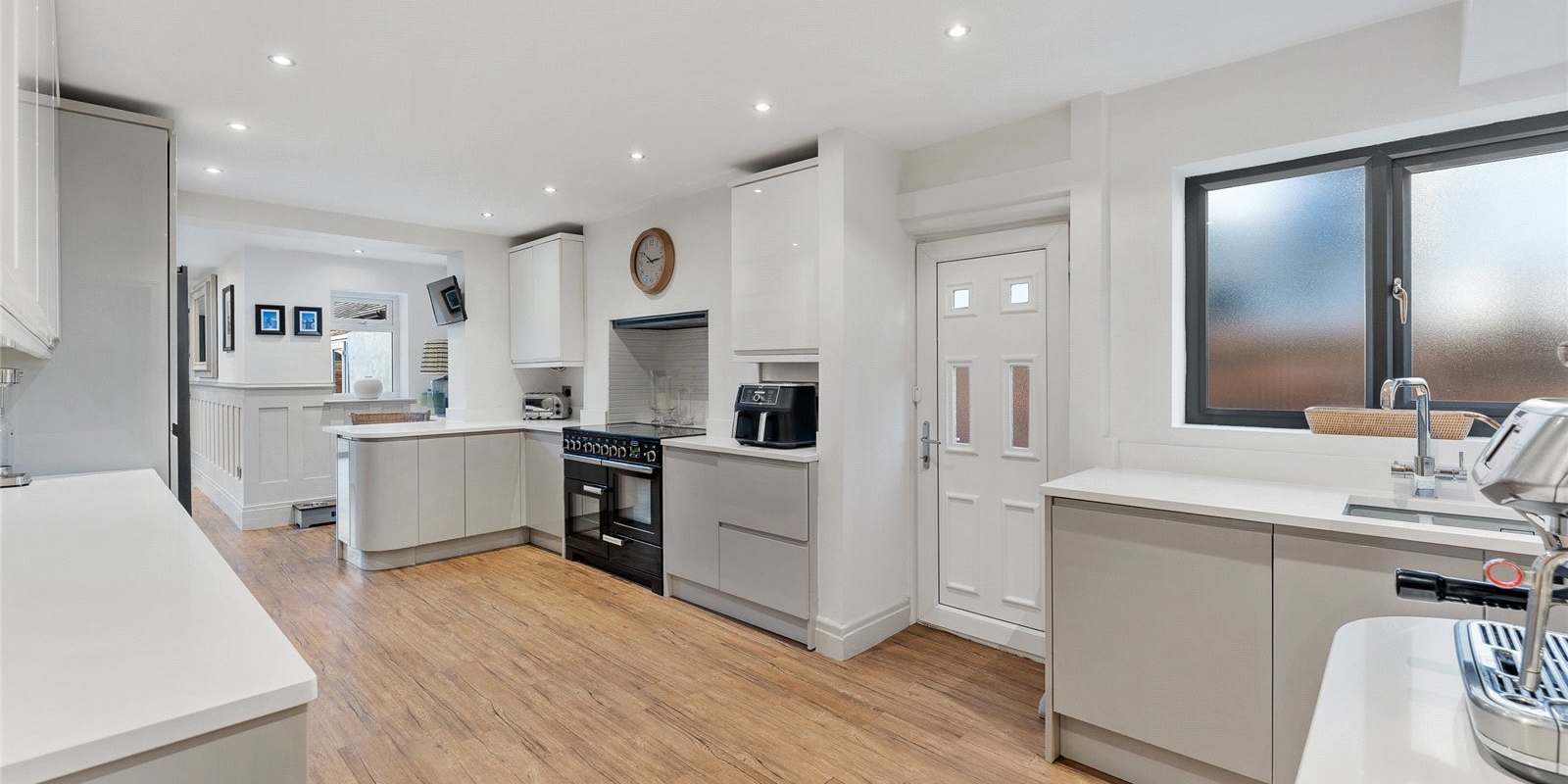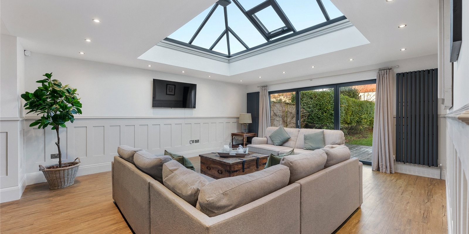 A striking lantern extension floods the heart of the home with natural light, forming a stunning open-plan living and dining space that connects effortlessly to the kitchen. Expansive bi-fold doors open directly onto the garden, establishing a seamless indoor-outdoor flow perfect for summer entertaining. The kitchen itself is a chef’s delight, centred around a statement Range cooker and designed to balance aesthetic appeal with family practicality. A separate utility room and a conveniently positioned guest WC ensure everyday essentials are neatly tucked away.
