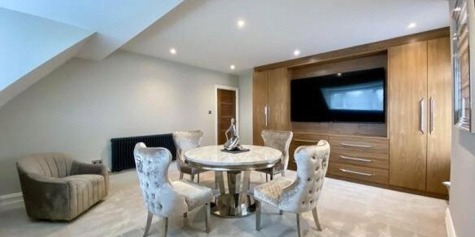 Upon entering, you are met with the exceptional style. The main reception room is flooded with natural light, creating a welcoming and airy ambiance. Flowing effortlessly from this space, the open-plan kitchen is both stylish and practical, boasting high-quality quartz worktops, integrated Bosch appliances, and ample storageideal for entertaining or everyday use.