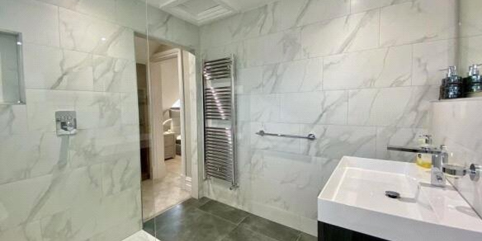 The property features three well-proportioned bedrooms, offering excellent storage solutions. The master bedroom benefits from its own en-suite, while the main bathroom is finished to a luxurious standard, featuring a separate bathtub, and a walk-in shower.