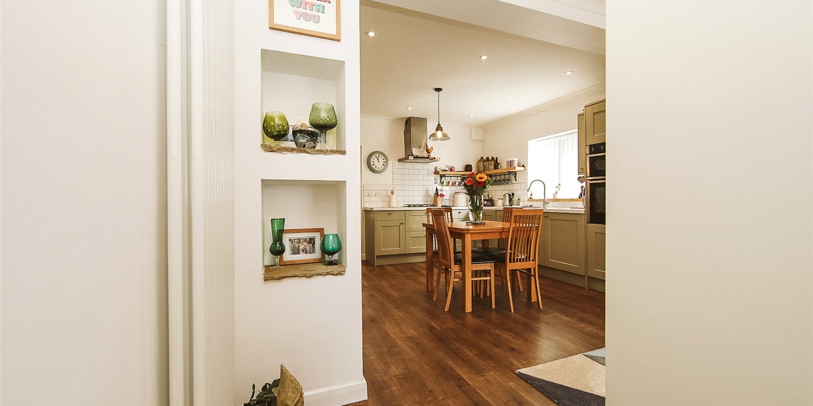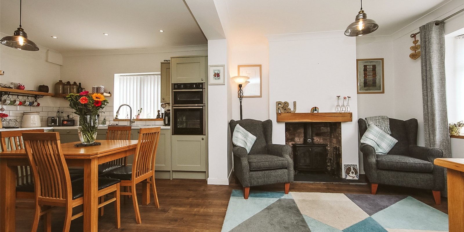 Upon entering, you’re welcomed into a hallway leading to a cosy lounge complete with a log-burning stove, ideal for relaxing evenings. Then the home opens up into a modern open-plan kitchen/dining area, fitted with contemporary units and appliances – a space designed for everyday living and hosting alike. Beyond this is a useful utility/storage room, which then flows through to the rear living and entertaining room, with French doors opening onto a sunny patio.