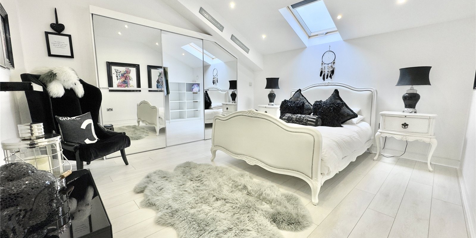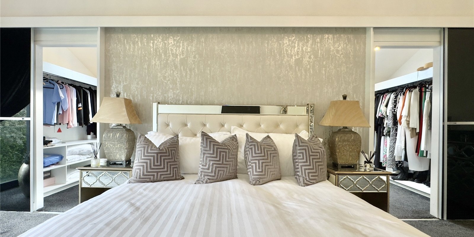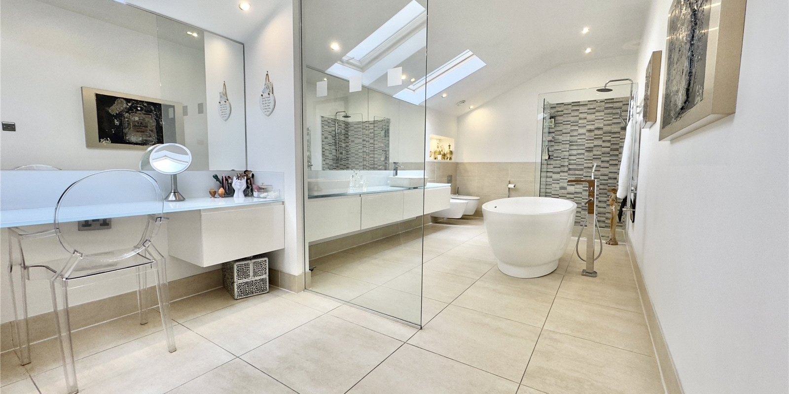 Each of the five bedroom suites is individually designed, complete with en-suite bathrooms and bespoke walk-in wardrobes, ensuring luxurious private accommodation. Externally, landscaped gardens, a garage and secure gated parking complete this outstanding property.