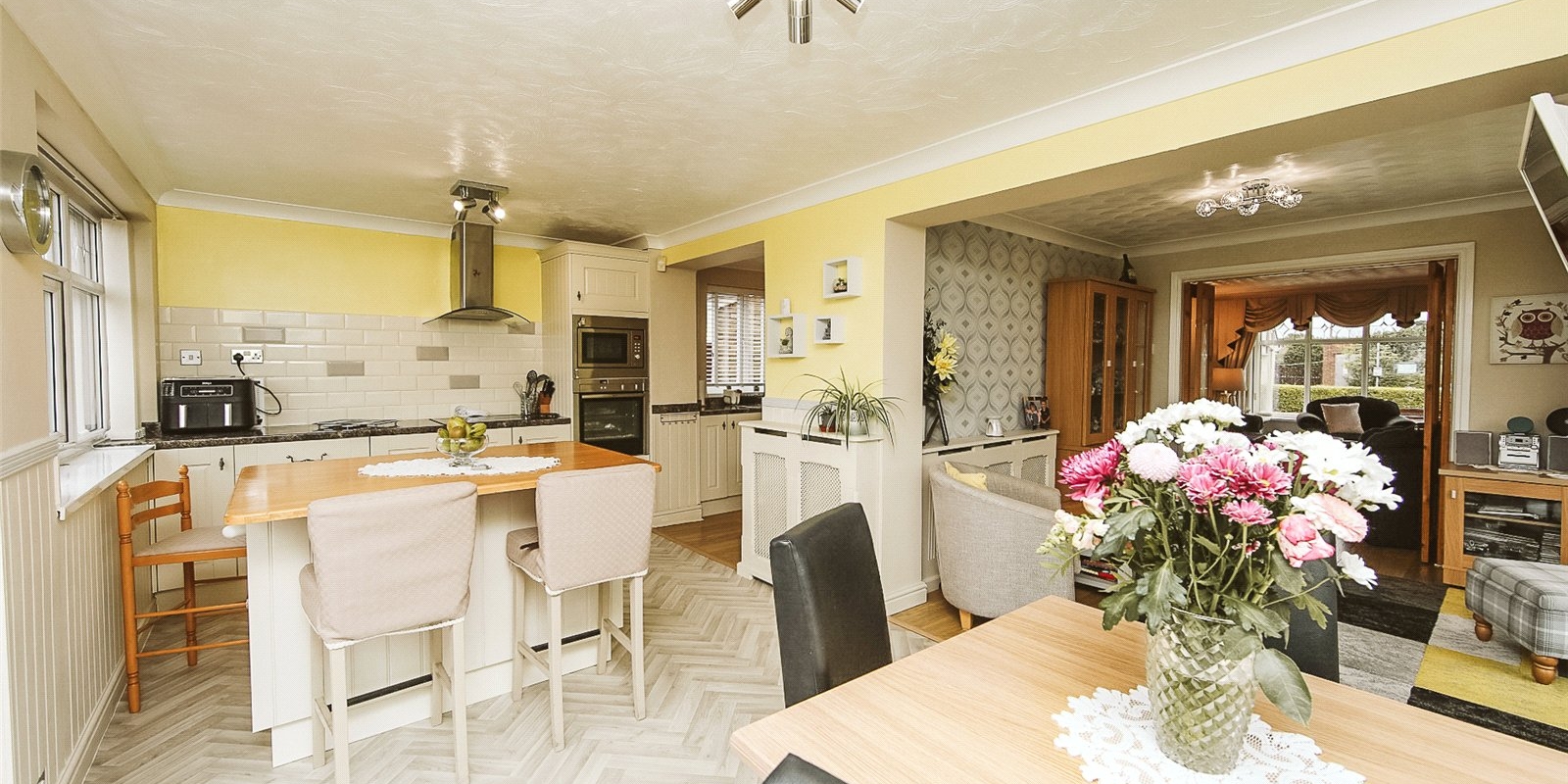 The ground floor is well laid out, beginning with a welcoming entrance hall and convenient WC. A spacious living room provides a cosy retreat, while the adjoining sun room fills the home with natural light and offers direct access to the garden. The open plan kitchen and dining area offers plenty of space for family meals and entertaining.