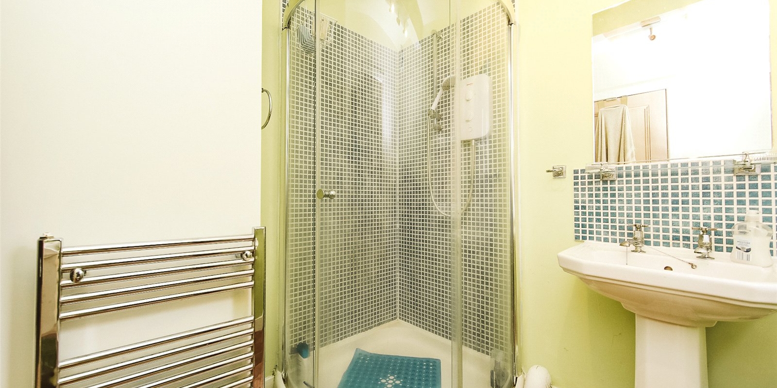 A well-appointed bathroom featuring a contemporary suite, including a bath with overhead shower, wash basin, and WC.
