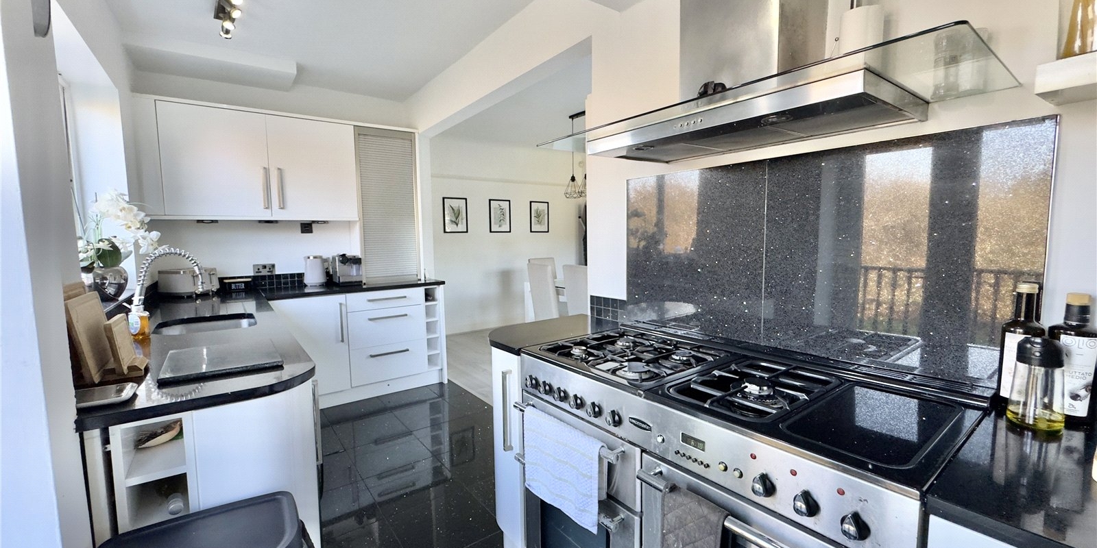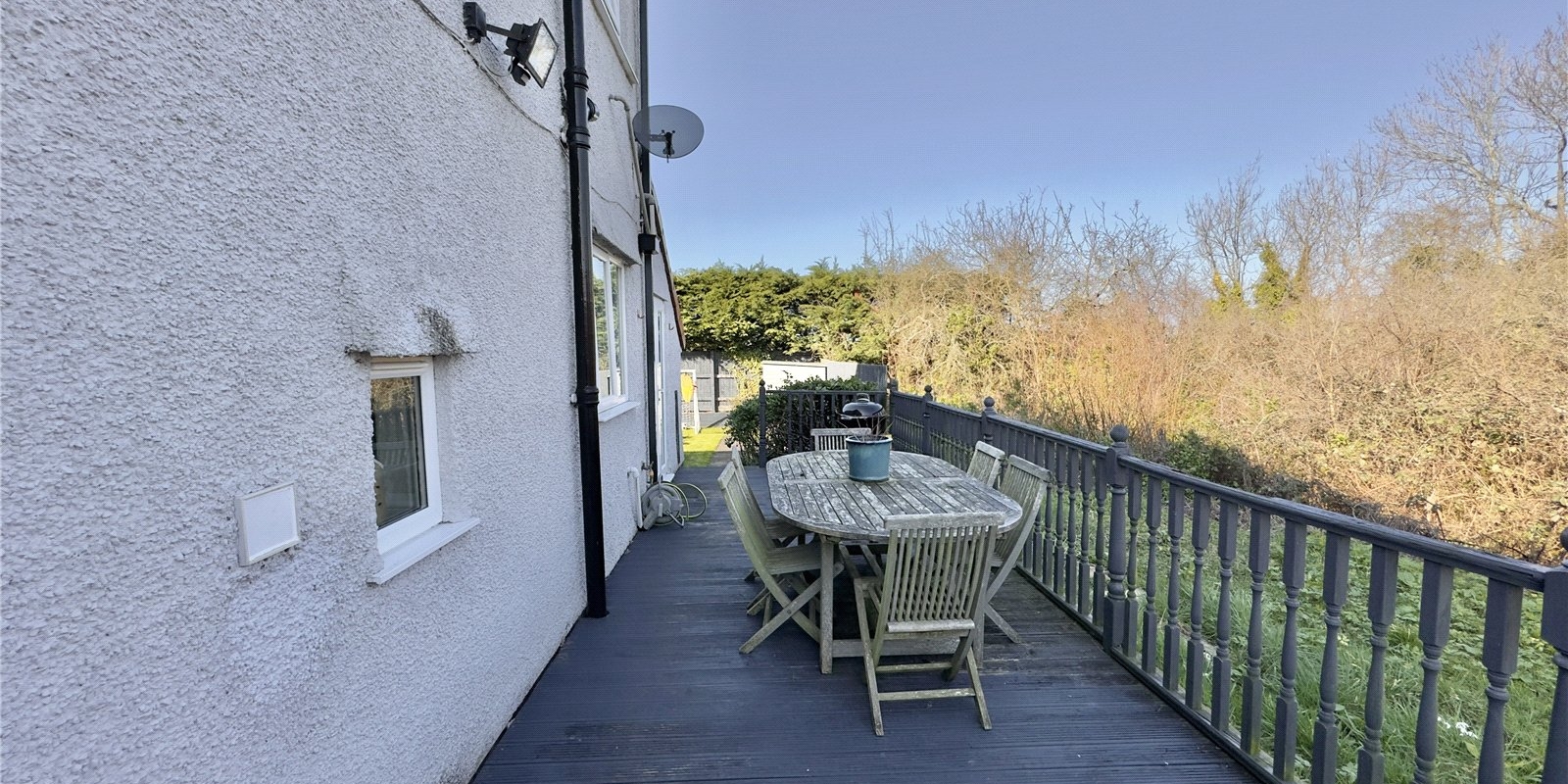 To the rear of the property, the heart of the home unfolds in the stylish kitchen and dining space, complete with wood burning fire. Designed with both everyday living and entertaining in mind, this bright and sociable area enjoys views over the garden, with French doors opening directly onto the decked terrace and seamlessly blending indoor and outdoor living.