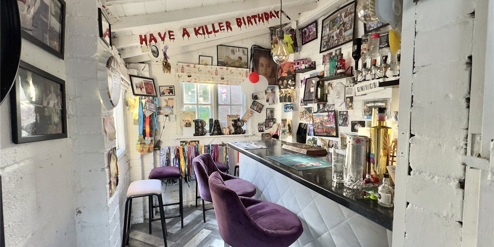 Step outside to discover multiple seating areas artfully arranged throughout the outdoor space, perfect for entertaining or quiet contemplation. The charming outbuilding, currently functioning as a delightful bar and utility area, adds considerable character and practical value to this already impressive package.